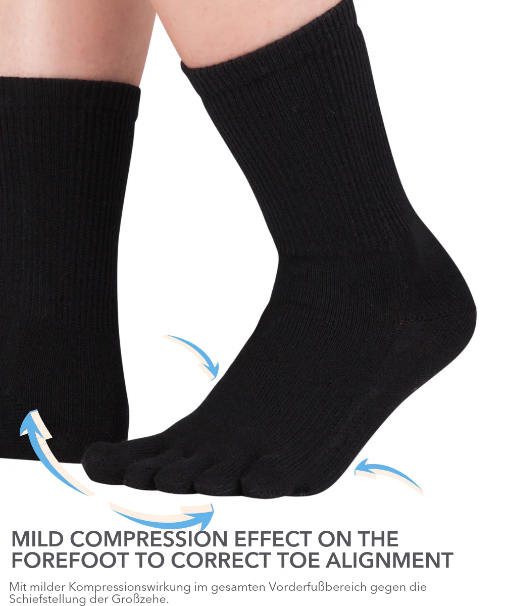 Thanks to a compression band, our toe socks pull the metatarsal bone, i.e. the joint affected by the Bunion , together. The light but constant pressure exerted on the bone causes the foot and big toe to spread slightly outwards by around 1°. Depending on the severity of the hallux, this can provide relief and further relieve the lateral muscles.